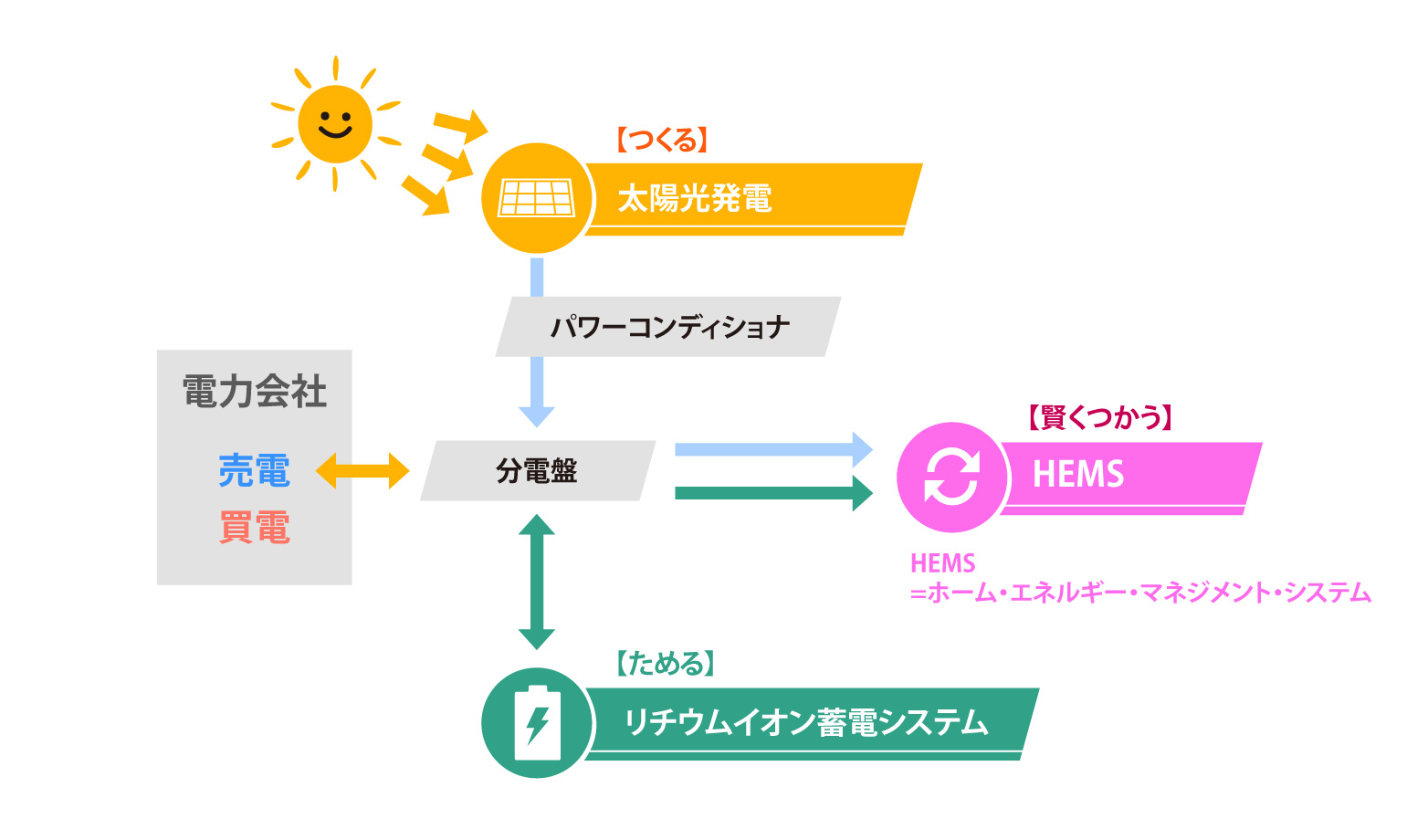 蓄電池は太陽光発電とHEMSとを併用することで、その効果を更に高めることができます。