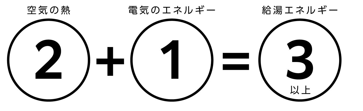 エコキュートは、[1]の電気エネルギーを使って、[2]の空気の熱をくみ上げ、[3]の給湯エネルギーを得ることができます。つまり電気エネルギーだけでお湯をわかすのに比べて、消費電力量は約1/3に低減し、とても経済的です。