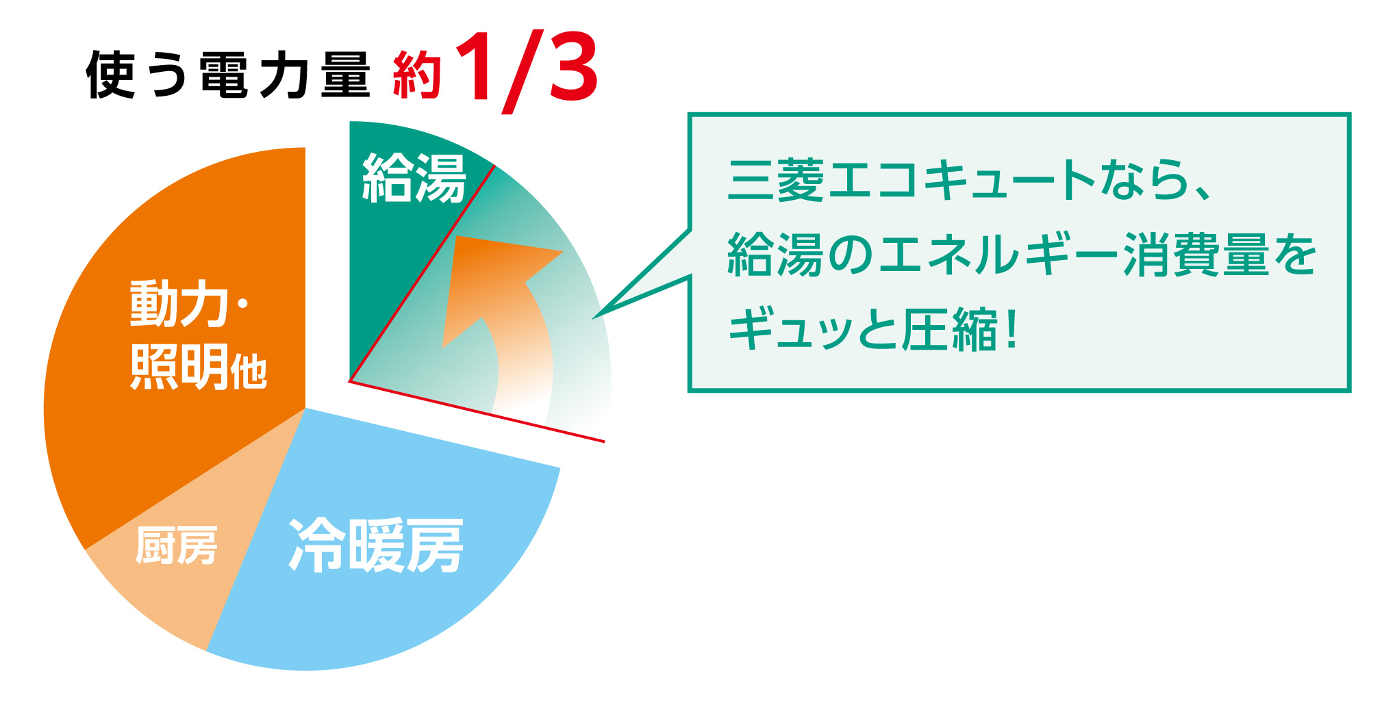 エコキュートなら、給湯に使う電力消費量が約1/3に