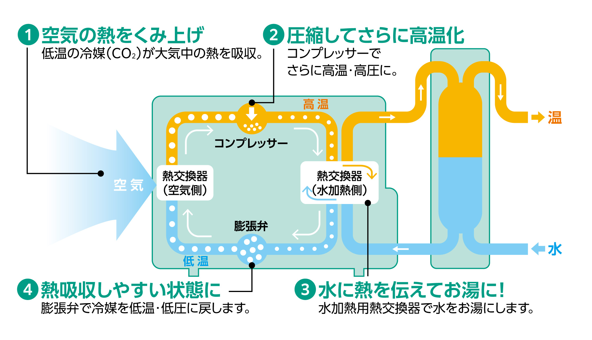 空気の熱を利用して効率よくお湯をわかす、